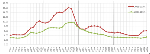 具體來看,2016年初生姜上市平穩(wěn),供應持續(xù)增加,價格穩(wěn)中略降,主要原因是2016年生姜供應面異常充足,而需求面持續(xù)表現(xiàn)低迷,且參市各方購銷積極性均受其打擊,導致整個老生姜交易階段的價格保持低位。新生姜上市之初,開秤價格并無優(yōu)勢,直到后續(xù)因積年庫存吃緊和新老交替青黃不接的斷口期出現(xiàn),加之高種植成本下的連年低價使姜農(nóng)惜售情緒見長,才逐漸抬升生姜市場行情。