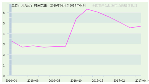 據(jù)全國農(nóng)產(chǎn)品批發(fā)市場價格信息網(wǎng)提供數(shù)據(jù),2016年4月至2017年4月,寧夏生姜價格趨勢與我國生姜價格總趨勢保持一致,如圖5所示。區(qū)內生姜價格最高價出現(xiàn)在2016年12月15日,為7.2元/公斤,由吳忠市鑫鮮農(nóng)副產(chǎn)品市場有限公司上報;市場最低價出現(xiàn)在2016年6月15日,為2.3元/公斤,由銀川北環(huán)批發(fā)市場上報。