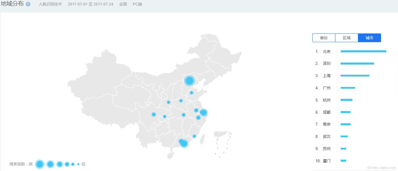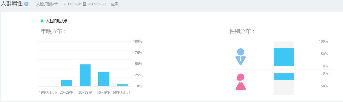 根據(jù)百度數(shù)據(jù)顯示,市場(chǎng)對(duì)于人臉識(shí)別技術(shù)的關(guān)注度,根據(jù)地域分布,主要集中在北京、深圳、上海、廣州、杭州等城市;根據(jù)年齡和性別分布,主要集中在男性青年群體。