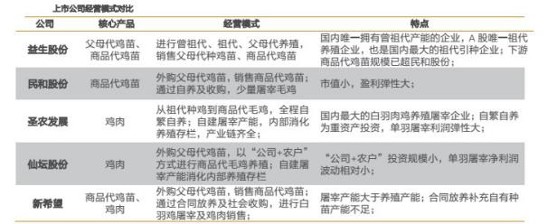從2010年益生股份上市之后,A股就已經(jīng)有了完整了白羽肉雞產(chǎn)業(yè)鏈。目前共有5家上市公司——民和股份、益生股份、圣農(nóng)發(fā)展、仙壇股份、新希望——擁有相關(guān)業(yè)務(wù)。各家的側(cè)重點略有不同。