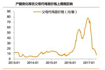 引種規(guī)模的下降意味著祖代存欄的下降,供給的減少將導致父母代雞苗銷售價格下降。由于2012年以前國內(nèi)白羽肉雞需求快速增加,因此,國內(nèi)白羽雞引種規(guī)增速的下降也會引起價格的上漲。例如,2010年的引種規(guī)模與2009年基本持平,僅增長3萬套。受此影響,父母代雞苗價格也從2010年9月份開始反彈。同樣的,隨著2014年引種規(guī)模的下降,父母代雞苗價格則從2014年3月見底回升,中間雖有波動,但從2015年10月即開始一輪快速上漲。也就是說,對于祖代產(chǎn)能的變化,父母代雞苗價格是一個重要的驗證指標。