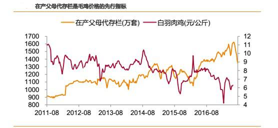 在產(chǎn)父母代存欄是商品代的直接產(chǎn)能,代表了中短期的供給能力。理論上,經(jīng)過3周孵化期+6 周育肥期后毛雞出欄,則在產(chǎn)父母代存欄是毛雞價格提前9-10周的先行指標,與毛雞價格走勢呈反相關(guān)。從實際運行來看,理論上走勢與實際走勢大體吻合。因此,在產(chǎn)父母代存欄是相對于毛雞價格提前兩個多月的先行指標。