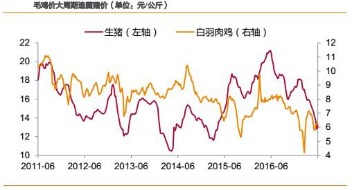 2)短周期內(nèi),受各自供求關(guān)系決定產(chǎn)品價格,則豬價、雞價走勢有可能會發(fā)生背離,但背離時間一般不會超過1個季度,且背離的時間一般出現(xiàn)在春節(jié)后的上半年。如2012年2月-4月,2014年2月-4月、2015 年3月-6月、2016年3月-6月、2017年2月-3月。