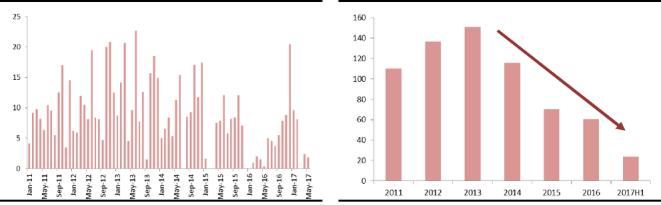 2015年以來,祖代雞引種在持續(xù)收縮過程中,總量上基本得到了控制。美國、法國、西班牙等重要引種來源國相繼被封關(guān),目前可以引種的國家十分有限。2017年上半年各品種共引進23萬套,比去年同期多出12萬套,主要是集中在今年1/2月份。