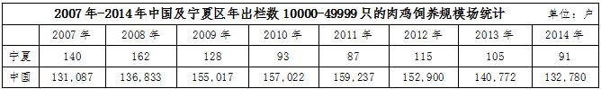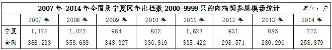 不僅如此,在肉雞飼養(yǎng)場的規(guī)模上也有明顯的差距。據(jù)wind數(shù)據(jù)統(tǒng)計,2014年,寧夏區(qū)內(nèi)肉雞年出欄數(shù)在1-1999只的肉雞飼養(yǎng)規(guī)模場戶數(shù)為133734戶,當年全國同規(guī)模的飼養(yǎng)場戶數(shù)高達21644679戶,占比為0.62%;年出欄數(shù)在2000-9999只的肉雞飼養(yǎng)規(guī)模戶數(shù),寧夏地區(qū)為723戶,全國為258379戶,占比0.28%;年出欄數(shù)在10000-49999只的肉雞飼養(yǎng)規(guī)模戶數(shù),寧夏地區(qū)為91戶,全國為132780戶,占比為0.07%。