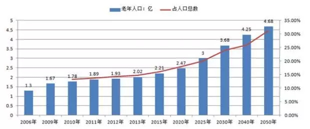 2004年底,中國(guó)60歲及以上老年人口為1.43億,2013年我國(guó)60歲及以上老年人口達(dá)2億人。截止2016年底,我國(guó)60歲以上的老齡人口高達(dá)2.3億人,位居世界之首。20世紀(jì)后期,為控制人口的急劇增長(zhǎng),國(guó)家推行計(jì)劃生育政策,使得人口出生率迅速下降,加快了中國(guó)人口老齡化的進(jìn)程。由于下世紀(jì)前半葉人口壓力仍然沉重,還要繼續(xù)堅(jiān)持計(jì)劃生育的國(guó)策,其結(jié)果將不可避免地使中國(guó)提早達(dá)到人口老齡化高峰。在第六次全國(guó)人口普查主要數(shù)據(jù)顯示,我國(guó)60歲及以上人口占13.26%,比2000年人口普查上升2.93個(gè)百分點(diǎn),其中65歲及以上人口占8.87%,比2000年人口普查上升1.91個(gè)百分點(diǎn),而且老年人口比例還以每年超過(guò)3%的速度增長(zhǎng),預(yù)計(jì)2025年將達(dá)到19.7%,到那時(shí),每五個(gè)中國(guó)人就有一個(gè)是60歲以上的人。按國(guó)家統(tǒng)計(jì)局2005年出版的報(bào)告,現(xiàn)在出生的中國(guó)人,男性平均壽命是69.6歲,女性的預(yù)期壽命是73.5歲。