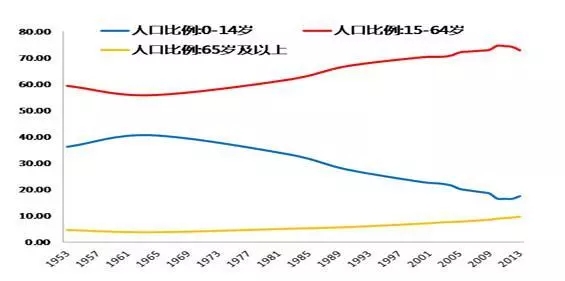 65歲以上老年人占總?cè)丝诘谋壤龔?%提升到14%,發(fā)達(dá)國(guó)家大多用了45年以上的時(shí)間。中國(guó)只用27年就可以完成這個(gè)歷程,并且將長(zhǎng)時(shí)期保持很高的遞增速度,屬于老齡化速度最快國(guó)家之列。預(yù)計(jì)到2045年左右,中國(guó)60歲以上人口將占到總?cè)丝诘?0%。該過(guò)程發(fā)達(dá)國(guó)家用了100年。圖2為1953年到2013年60年的人口比例變化情況,中國(guó)的高齡化趨勢(shì)明顯。