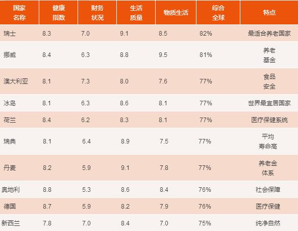 法盛全球資產(chǎn)管理公司(Natixis Global Asset Management),根據(jù)世界銀行、世界衛(wèi)生組織等提供的數(shù)據(jù),從醫(yī)療環(huán)境、預(yù)期壽命、金融穩(wěn)定和生活質(zhì)量等20個(gè)方面,綜合比較了全球150個(gè)國(guó)家的養(yǎng)老情況,評(píng)出了前十名: