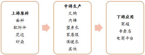 萊卡內衣上游原料主要有面料、附配件、花邊、丈根、印染,內衣生產廠將這些原料經過研發(fā)設計,生產出相應的內衣產品:文胸、內褲、塑身衣、家居服、保暖衣等。下游終端零售為:商超、專賣店、店商平臺。