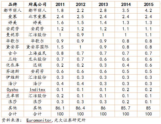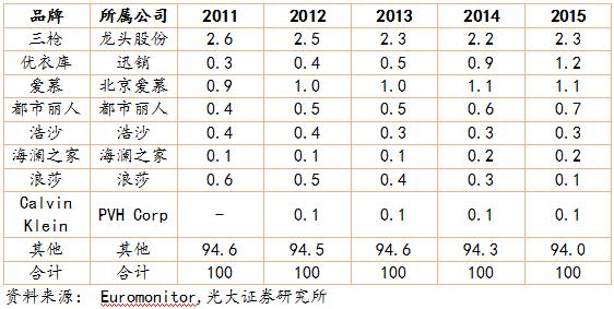 內衣作為消費者的第二層“肌膚”,消費者對內衣的消費比其他成衣具備更強的忠誠度,進入 21 世紀后,消費者對內衣品牌的認可也越來越強。 雖然部分品牌由于品牌老化導致市占率降低,但是總體看,前 16 家女士內衣品牌的市場份額從 2011 年的 13.9%提升到了 2015 年的 15%。前八大男士內衣品牌的市占率從 5.4%提升到 6%。