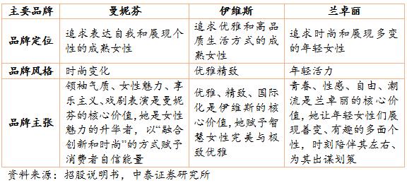 公司實行多品牌運作戰(zhàn)略,針對不同年齡段和不同風格的消費者推出三個中高端核心品牌“曼妮芬”、 “伊維斯”和“蘭卓麗”,三個副牌COYEEE、Bodybeauty 和喬百仕。其中,主打品牌“曼妮芬”連續(xù) 12 年市占率第一,其市占率長期領先于規(guī)模最大的內衣公司安莉芳的主品牌“安莉芳”。第二大品牌“伊維斯”連續(xù)兩年市場份額排名前十。