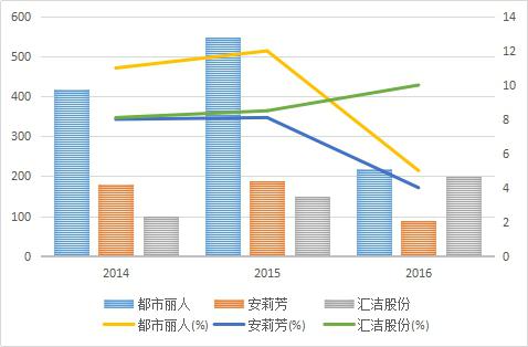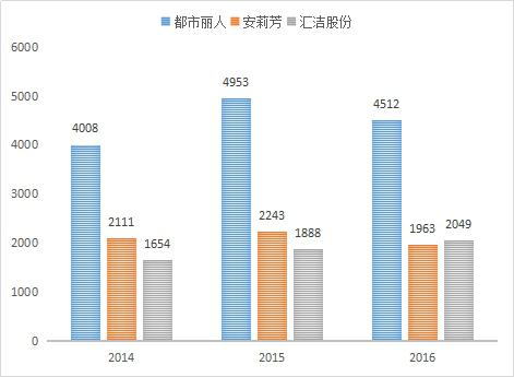 考慮到使用萊卡材料內衣企業(yè)主要是中高端企業(yè),企業(yè)占市場份額較大,數據可獲取等因素,本部分主要針對中高端內衣企業(yè)安莉芳集團(以下簡稱為:安莉芳)、深圳匯潔集團股份有限公司(以下簡稱為:匯潔股份)、大眾性企業(yè)廣東都市麗人實業(yè)有限公司(以下簡稱:都市麗人)進行分析。