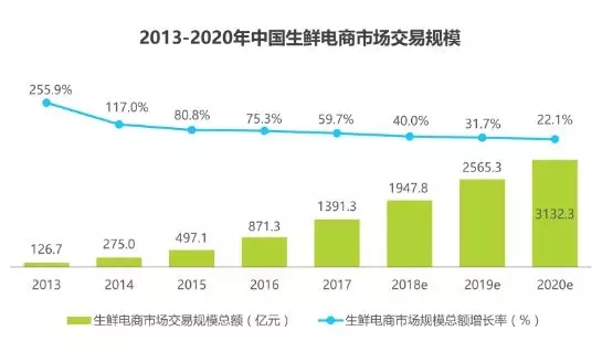 2017年中國(guó)生鮮電商市場(chǎng)交易規(guī)模約為1391.3億元,同比增長(zhǎng)59.7%,預(yù)計(jì)2020年,生鮮電商交易規(guī)模可以達(dá)到3132億元。一方面基于消 費(fèi)者消費(fèi)習(xí)慣養(yǎng)成,另一方面基于冷鏈和倉(cāng)儲(chǔ)系統(tǒng)迅速完善。