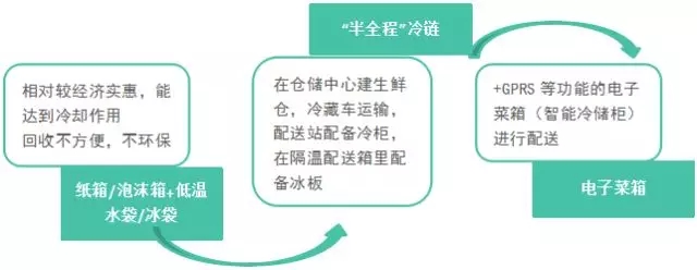 目前國(guó)內(nèi)有三種冷鏈配送方式,占比最大的是第一種。相比國(guó)外的冷鏈配送,中國(guó)冷鏈配送還不夠完善,也非真正的全程冷鏈,容易造成生鮮的損耗高的問(wèn)題,用戶體驗(yàn)差,冷鏈配送未來(lái)?yè)碛休^大完善空間。