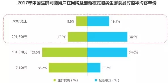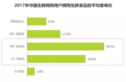 101-200元為生鮮網(wǎng)購(gòu)單均消費(fèi)集中段,51-100元為第二單均消費(fèi)段。