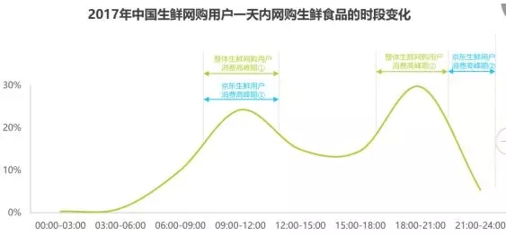 18:00-21:00是生鮮食品的消費(fèi)集中段,用戶根據(jù)需求的即時(shí)性選擇不同的平臺(tái)購(gòu)買生鮮食品。