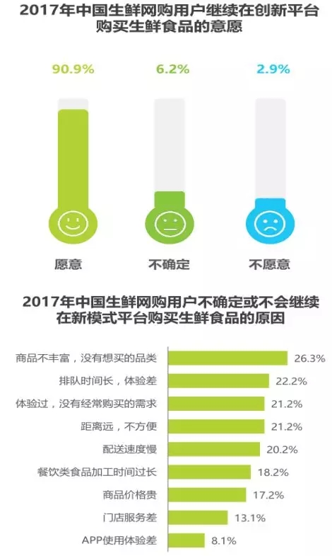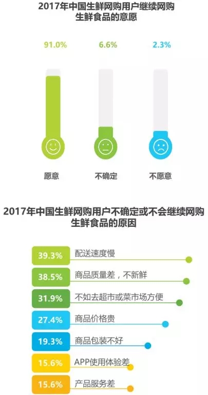 九成以上用戶愿意繼續(xù)網(wǎng)購(gòu)生鮮食品,配送速度慢和品質(zhì)問(wèn)題是用戶不確定或不會(huì)繼續(xù)購(gòu)買的主因。