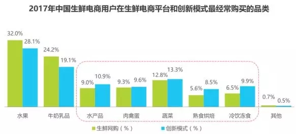 水果、乳品是創(chuàng)新模式最受歡迎的品類,在創(chuàng)新模式購(gòu)買水產(chǎn)品、肉禽蛋及蔬菜等品類用戶占比更高。