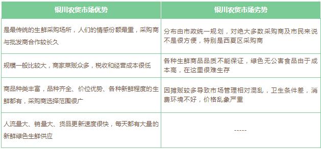 在銀川本地,主城范圍內(nèi)除最早建立的北環(huán)批發(fā)市場(chǎng)外,再?zèng)]有專業(yè)的大型生鮮批發(fā)市場(chǎng),近幾年發(fā)展起來(lái)的有:四季鮮果蔬批發(fā)市場(chǎng)、21世紀(jì)冷鏈批發(fā)市場(chǎng)、海吉星農(nóng)副產(chǎn)品物流園、潤(rùn)恒農(nóng)產(chǎn)品市場(chǎng)等都在郊區(qū)。大型農(nóng)產(chǎn)品交易市場(chǎng)是傳統(tǒng)生鮮流通中不可缺少的一環(huán),是各社區(qū)農(nóng)貿(mào)市場(chǎng)及超市生鮮尤其是蔬菜水果的主要來(lái)源,具有成交量大、知名度高、社會(huì)影響大、流通體系健全、配套完整等優(yōu)勢(shì),但也存在傳統(tǒng)生鮮流通方式的不足。