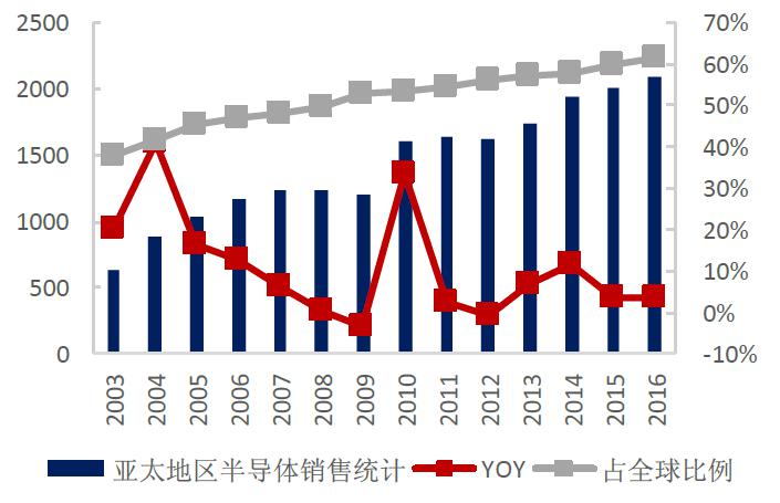 分區(qū)域來看,亞太地區(qū)主導地位日益顯著,占全球市場的比例有望保持在60%。全球半導體市場主要分布于美洲、歐洲、日本和亞太地區(qū),且市場格局相對清晰。亞太地區(qū)為第一大市場,占據(jù)全球50%以上的市場份額,其次為美洲市場,約占全球市場的20%,再者為歐洲和日本市場,兩者體量相當,均約占全球市場的10~12%。