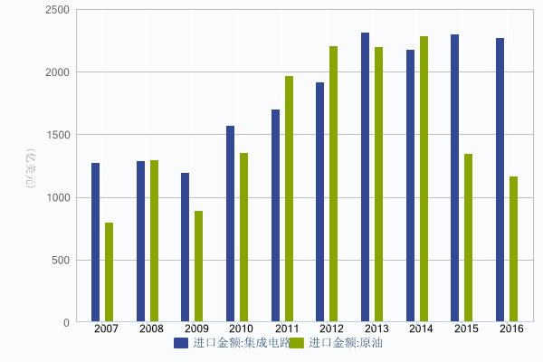 中國集成電路的進口持續(xù)維持高位。2016年,集成電路進口額達到2270.7億美元,比上年下降了1.2%,但是也連續(xù)四年超過了2000億美元,是價值最高的進口商品。同期出口集成電路613.8億美元,下降11.1%,貿(mào)易逆差高達1657億美元。預計未來幾年,集成電路進口額仍將維持高位。