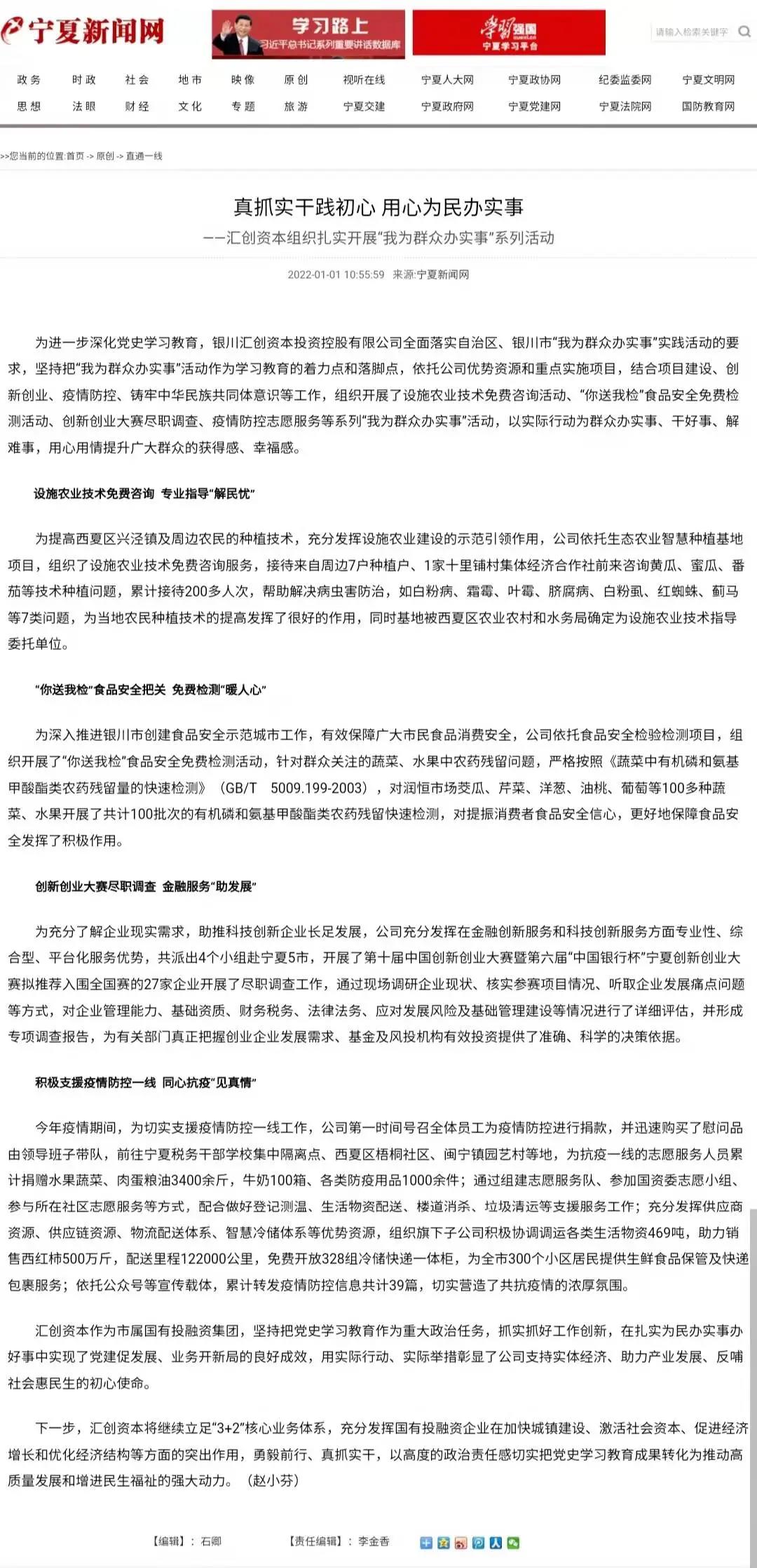 為進(jìn)一步深化黨史學(xué)習(xí)教育,匯創(chuàng)資本全面落實(shí)自治區(qū)、銀川市“我為群眾辦實(shí)事”實(shí)踐活動(dòng)的要求,堅(jiān)持把“我為群眾辦實(shí)事”活動(dòng)作為學(xué)習(xí)教育的著力點(diǎn)和落腳點(diǎn),依托公司優(yōu)勢(shì)資源和重點(diǎn)實(shí)施項(xiàng)目,結(jié)合項(xiàng)目建設(shè)、創(chuàng)新創(chuàng)業(yè)、疫情防控、鑄牢中華民族共同體意識(shí)等工作,組織開(kāi)展了設(shè)施農(nóng)業(yè)技術(shù)免費(fèi)咨詢(xún)活動(dòng)、“你送我檢”食品安全免費(fèi)檢測(cè)活動(dòng)、創(chuàng)新創(chuàng)業(yè)大賽盡職調(diào)查、疫情防控志愿服務(wù)等系列“我為群眾辦實(shí)事”活動(dòng),以實(shí)際行動(dòng)為群眾辦實(shí)事、干好事、解難事,用心用情提升廣大群眾的獲得感、幸福感,獲得了寧夏新聞網(wǎng)宣傳報(bào)道。